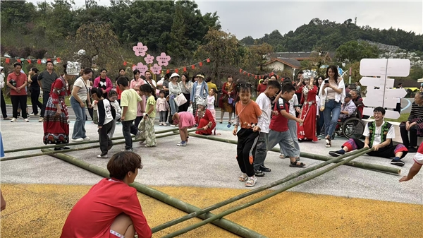 名山区梅花谷精灵乐园内,小朋友们正在跳竹竿舞